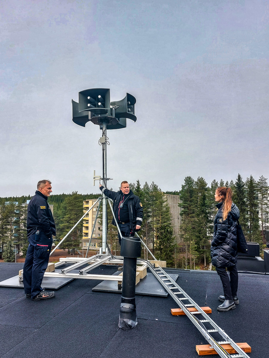 Matkalla seuraavaan tarkastuskohteeseen kävimme tarkastamassa lähietäisyydeltä Lapin hyvinvointialueen uuden suurtehoväestöhälyttimen. Sen kantoetäisyys on noin kilometristä puoleentoista suuntaansa. Kaupanpäälle näimme hienot maisemat horisonttiin.
